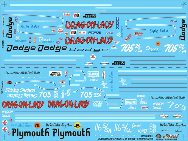 | | Title | Drag On Lady '68 Dart & '65 Plymouth Belvedere | | Part Number | 7153/SSHD | | Driver | Shirley Shahan | | Team | | | Car | Hemi Dart | | Series | Drag | | Season | '68 | | Scale | 1/25th | | Kit | '68 Dart is designed to fit on the Revell #85-4217 Hemi Dart model kit. The '65 Plymouth Belvedere Sedan body is available from Perry's Resins @ www.perrysresin.com | | Testors | | | Black Gold | Tru Blue Pearl BC36 and White BC26 | | | | |