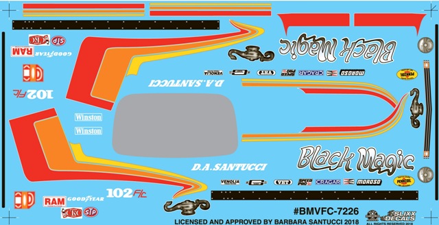 | | Title | D.A. Santucci's Black Magic Vega F/c | | Part Number | 7226/BMVFC | | Driver | D.A. Santucci | | Team | | | Car | Vega Funny Car | | Series | Drag | | Kit | This decal is designed to fit on the Comp Resins '77 Vega Funny Car part #CR-1031 available at slixx.com | | Scale | 1/24th | | Paint | Black | | Info | | |