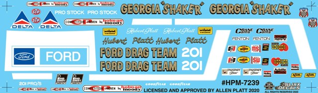 | | Title | Hubert Platt's ' 71 Maverick | | Part Number | 7239/HPM | | Driver | Hubert Platt | | Car | '71 Maverick | | Series | Drag | | Kit | This decal is designed to fit on Jo-Han, AMT or Comp Resins #CR-5020 Maverick Pro Stock | | Scale | 1/24th | | tPaint | Cars were Acapulco blue & white | | Info | Book and DVD reference for sale on the Georgia Shaker website at www.georgiashaker.com | |