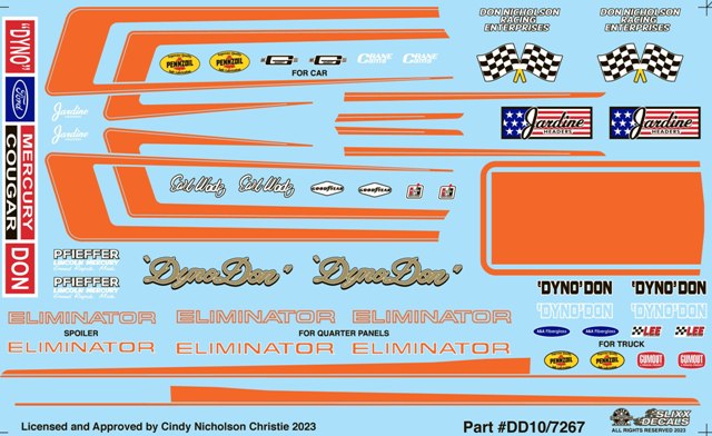 | | Title | Dyno Don's Cougar Super Stock and Ramp Truck | | Part Number | DD10/7267 | | Driver | Dyno Don Nicholson | | Car | Cougar Super Stock and Ramp Truck | | Series | Drag | | Kit | This decal is designed to fit on the AMT Cougar Eliminator kit and the Moebius Ford Ramptruck | | Scale | 1/25th | |
