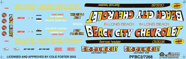 | | Title | Beach City Roadster Corvette Funny Car and Ramp Truck | | Part Number | PFBC2/7268 | | Driver | Pat Foster | | Car | Corvette Roadster Funny Car | | Series | Drag | | Kit | This decal is designed to fit on the Comp Resins Corvette Roadster Funny Car, Part #CR-4013 (available at slixx.com) | | Scale | 1/24th | |