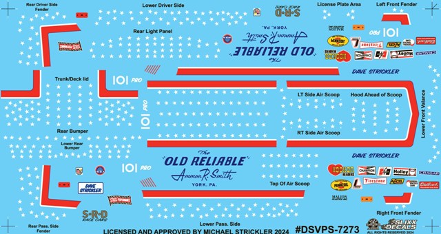 x | | Title | Dave Strickler's Old Reliable Vega Pro Stock | | Part Number | DSVPS/7273 | | Driver | Dave Strickler | | Car | Vega Pro Stock | | Series | Drag | | Kit | This decal is designed to fit on reissued Round 2 Grumpy Vega Pro Stock kit | | Scale | 1/25th | | | Special Thanks with reference on this car, to both Jim Kampmann & Ariel Cordero |