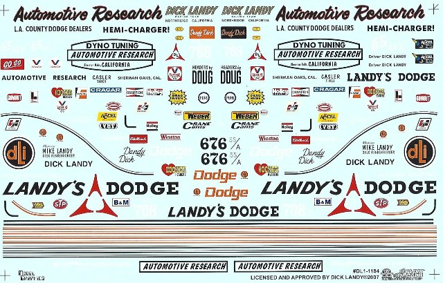 | | Part Number | 1184/DL1 | | Driver | Dick Landy | | Car | Dodge | | Series | Drag | | Season | 1960'S Mopars and 1973 Dodge Sport ProStock | | Scale | 1/25 | | Kit | 65 Dodge AFX or '70's Dodge Dart Sport ProStock. You can use the recently released Round 2 Dodge Dart Sport with modifications. | | Paint | White, Black and Orange | | | | | General Info. | Able to build one of three cars | |